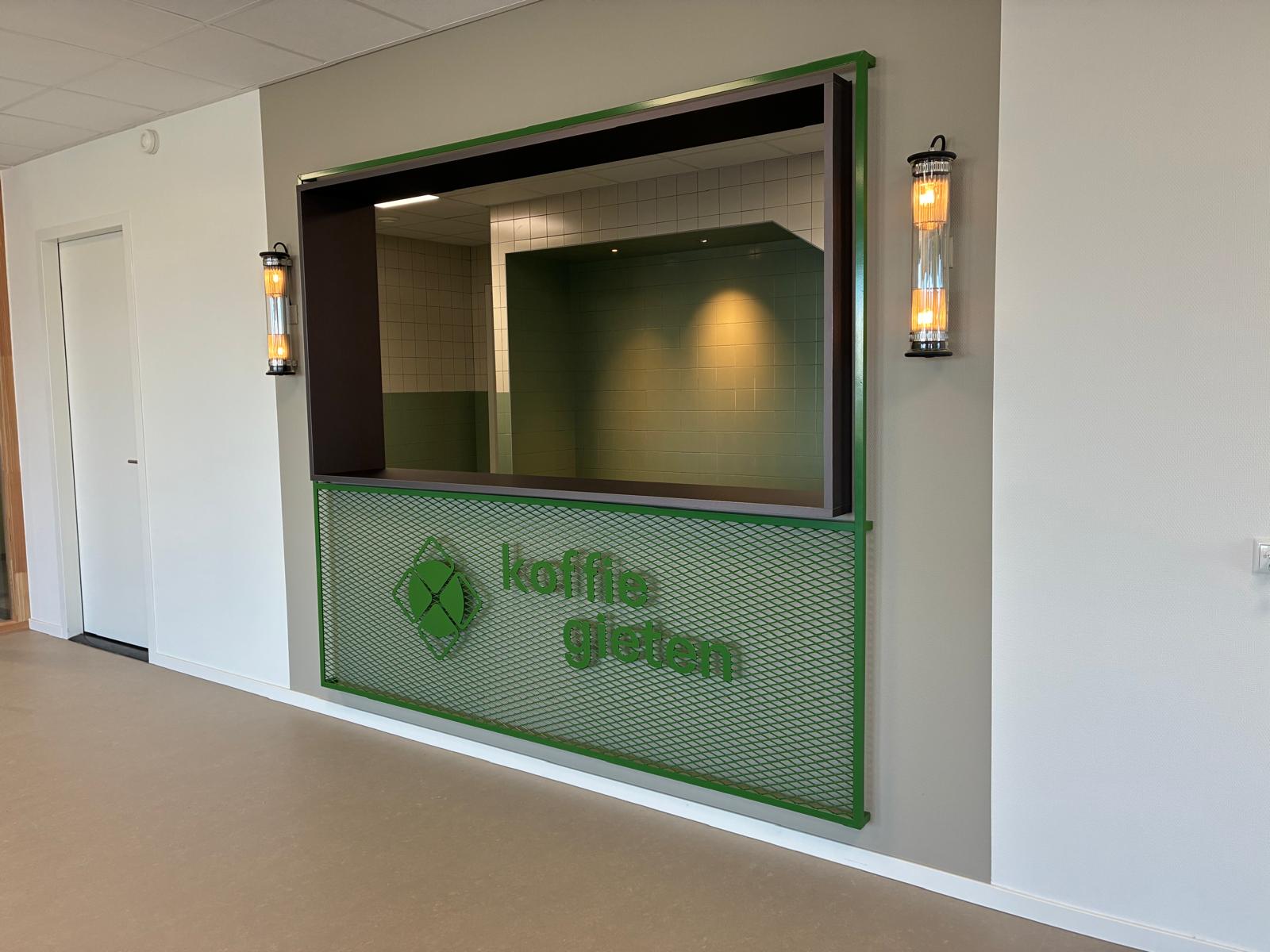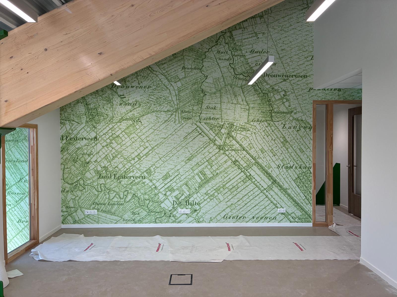In Gieten komt de opleverdatum al langzaam in zicht. De afgelopen tijd is er veel werk verricht met betrekking tot de afwerking. Het prachtige fotobehang is aangebracht, de mobiele wandsystemen zijn geinstalleerd. Daarnaast is een grote watertank geplaatst. Hierin wordt regenwater opgevangen wat gebruikt gaat worden voor de beregening van het sedum dak. Ook de plantjes in de groene voorgevel worden met dit water gevoed. Nog even en er kan koffie gedronken worden in de prachtige groene keuken, want overal in dit pand komt het -John Deer én duurzaam- groen terug!