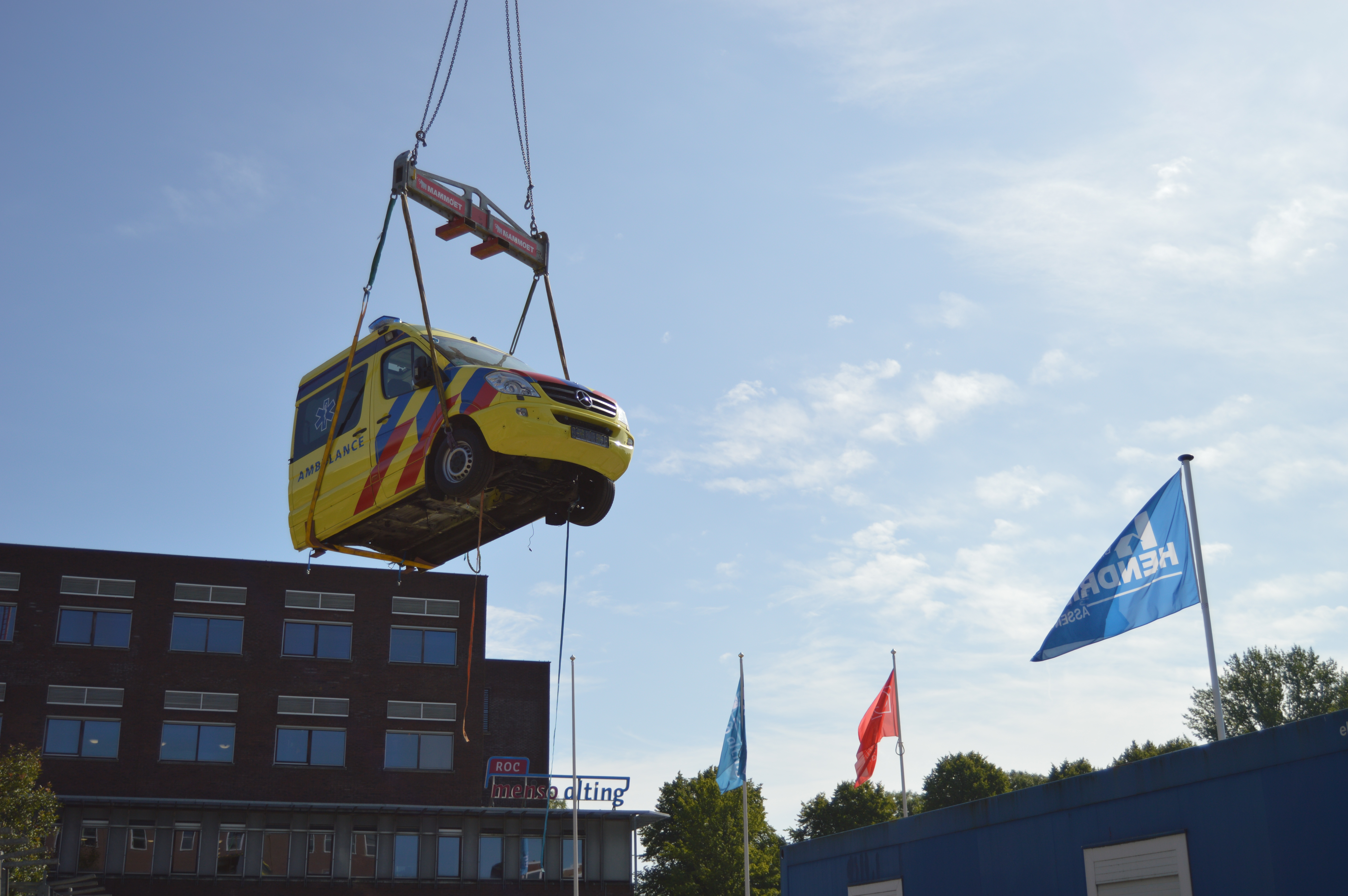 Met behulp van de expertise van Mammoet Nederland werd de ambulance met een grote hijskraan omhoog gehesen. Dankzij de rust, kalmte en vooral een uitstekende communicatie tussen de mensen binnen en de kraanmachinist buiten, verliep de hijsoperatie vlekkeloos.