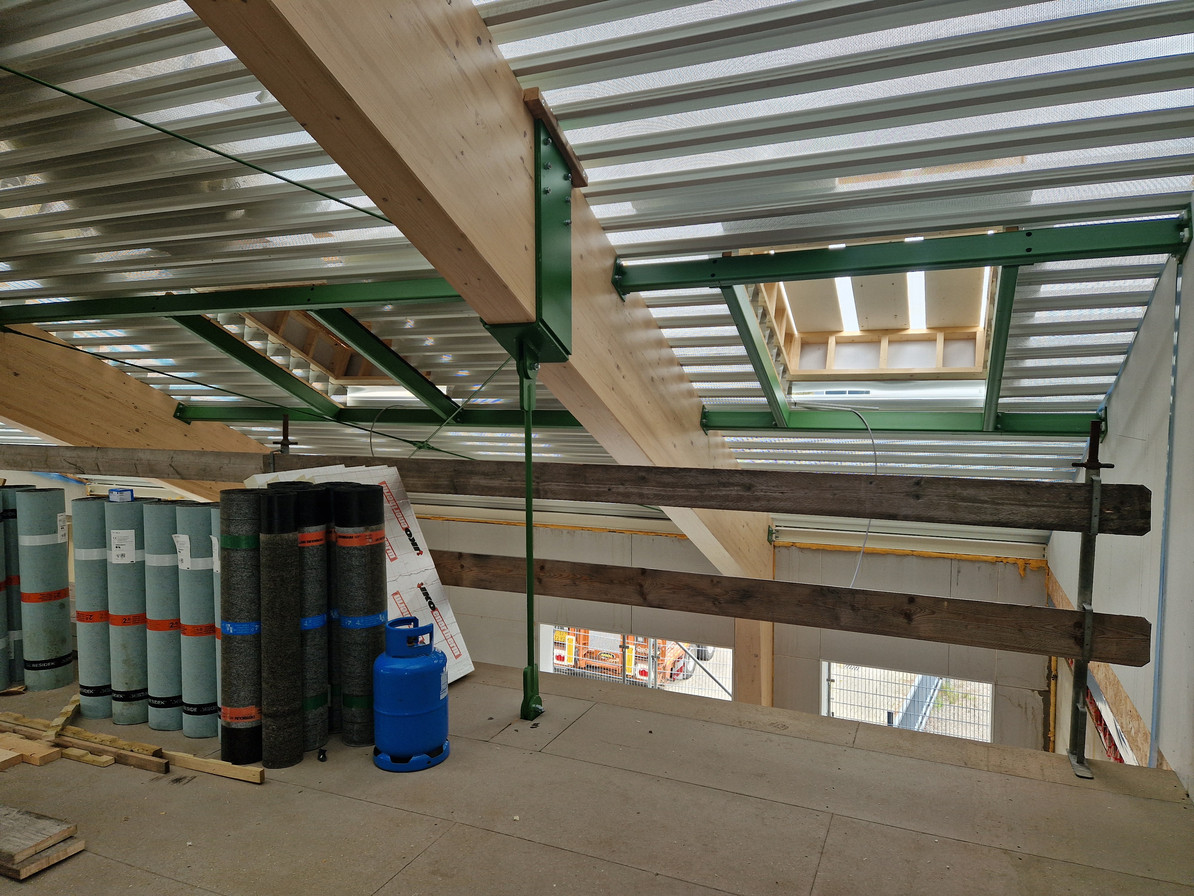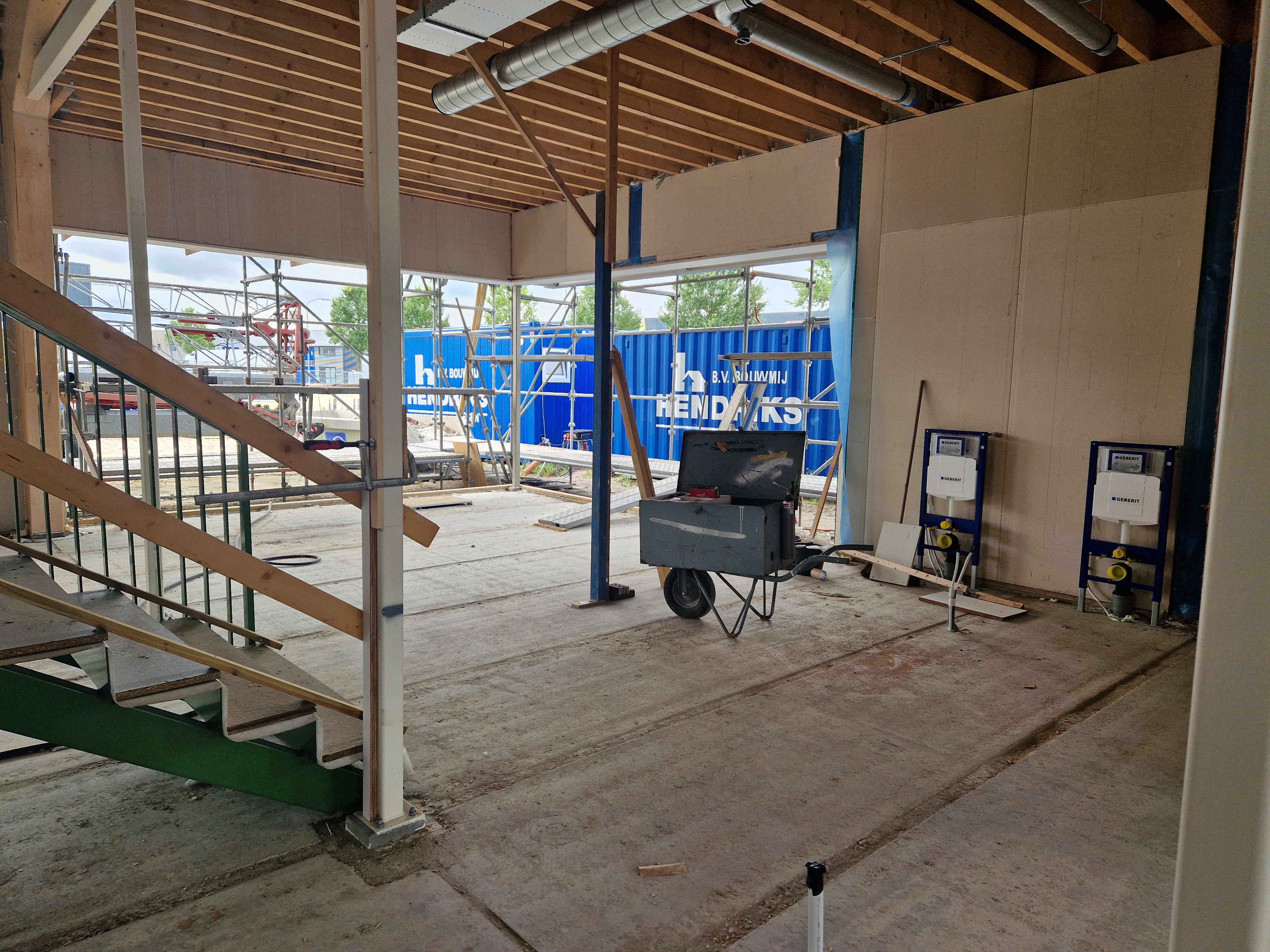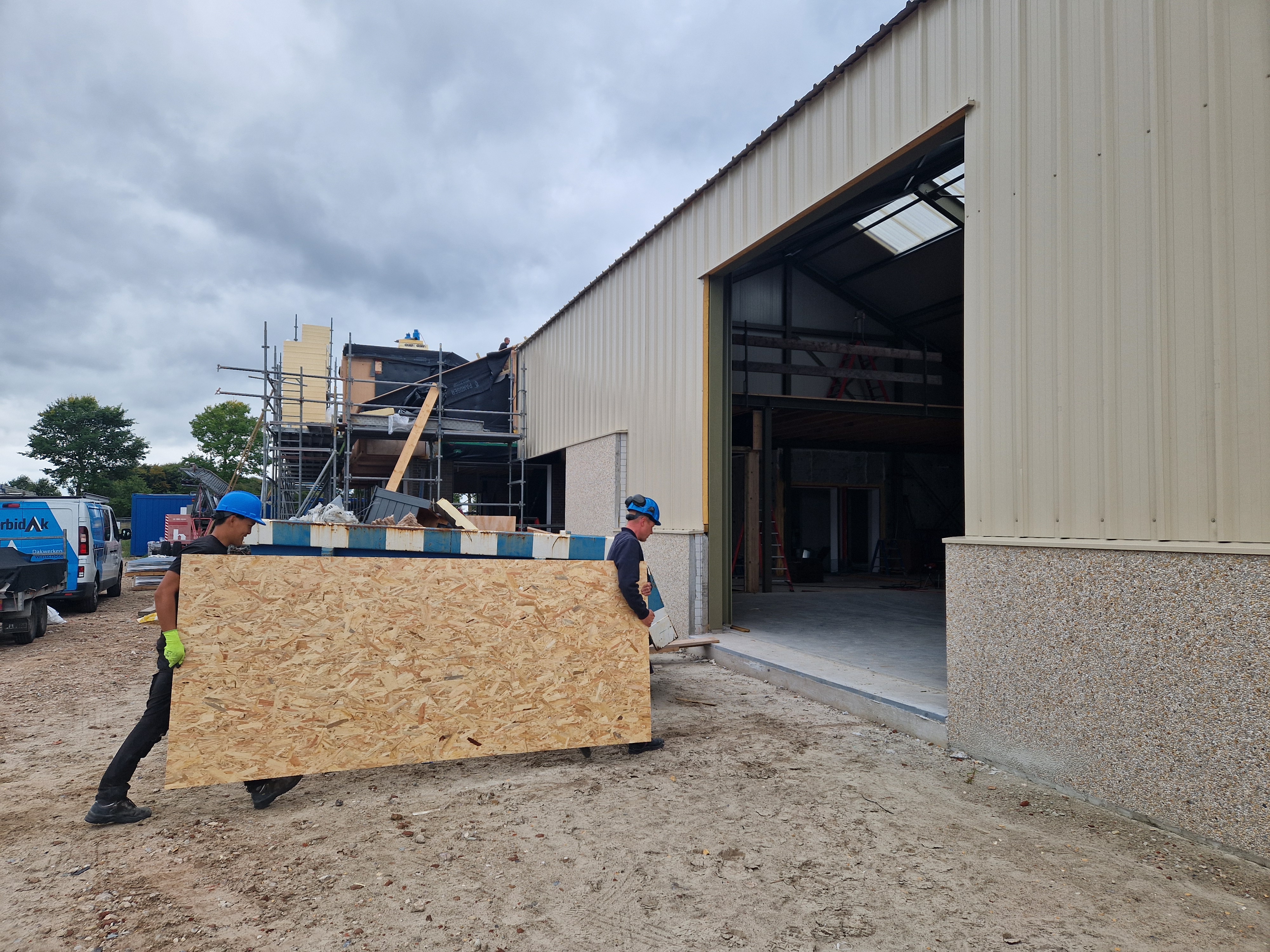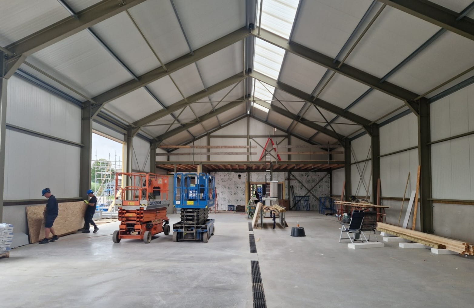 Verder zijn de mannen van Hendriks druk met de afwerking aan de binnenkant van het gebouw. Ook daar komt de kleur groen terug; John Deere Tractor Groen! De windverbanden, Willems Ankers en houten spanten blijven in zicht om een industriële look te creëren. En omdat de opslagruimte voor tractors gebruikt zal worden, is in het ontwerp van de vloerbedekking in de kantoorunits een mooie tractorband afdruk verwerkt. Dit project zit dus vol leuke details.