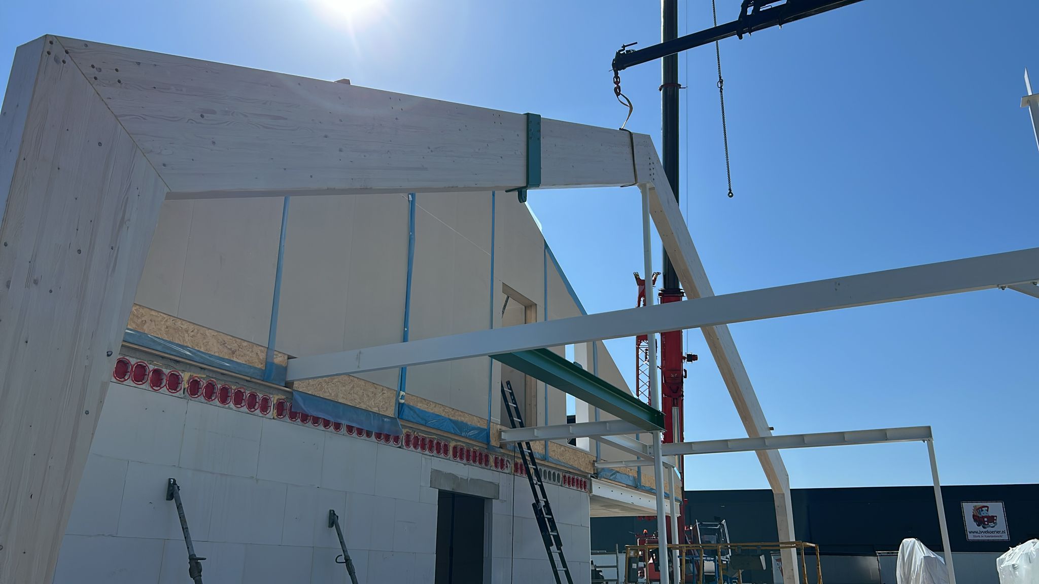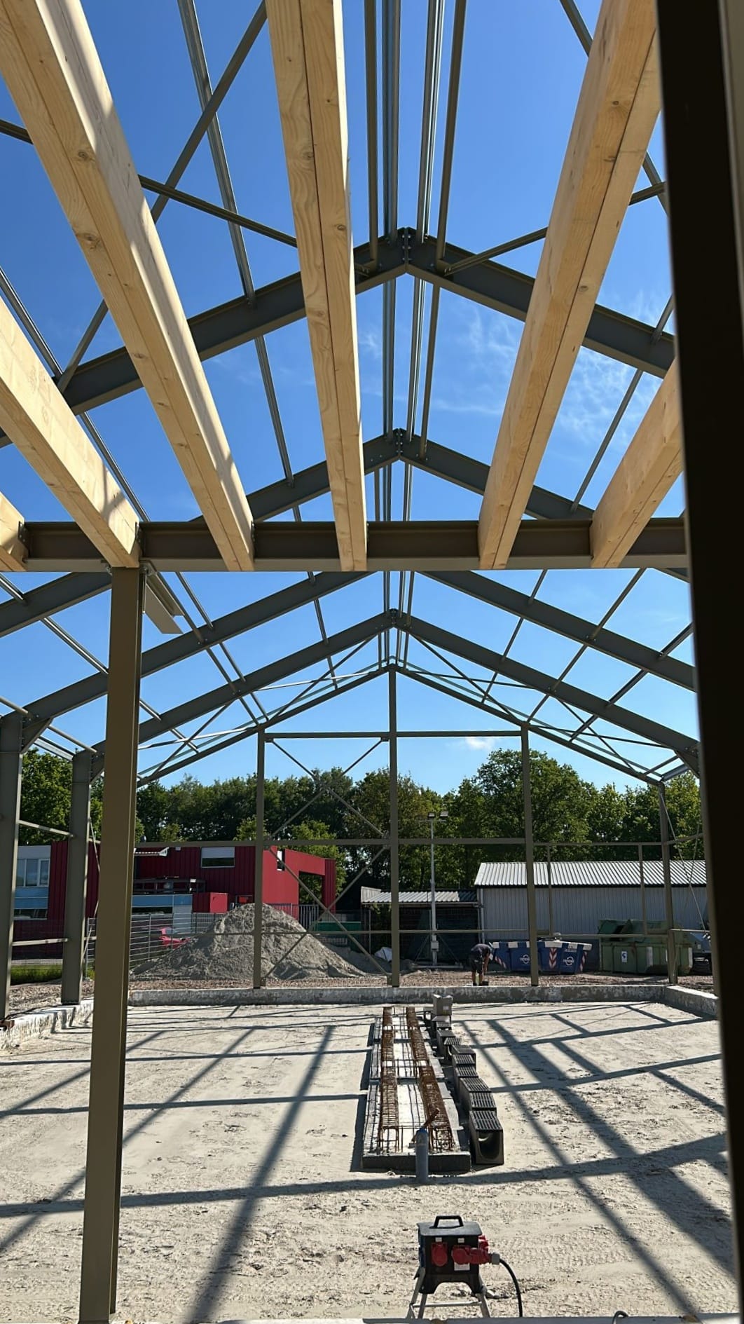 Inmiddels staat de staalconstructie en zijn wij druk met monteren van het houten skelet.
