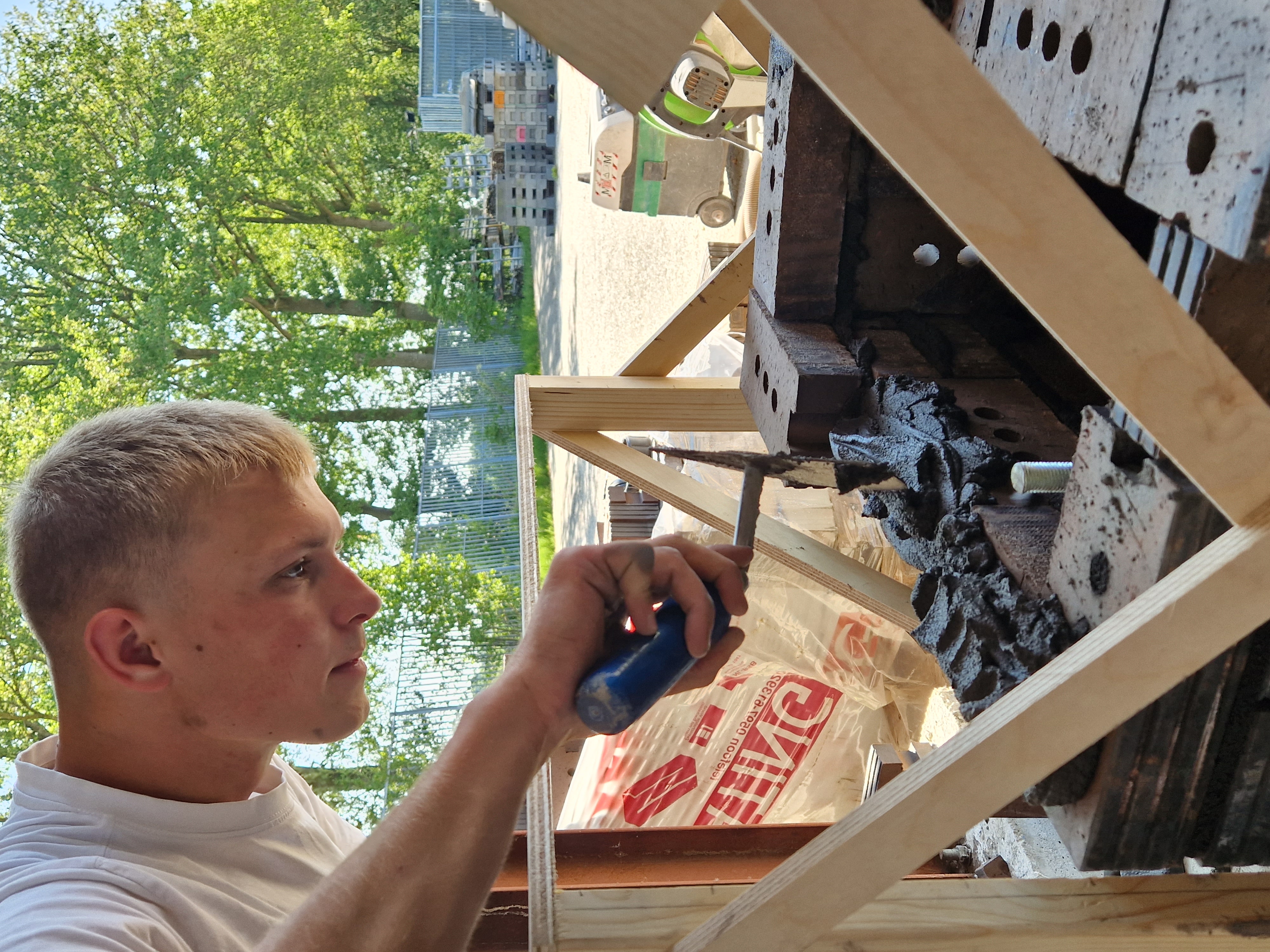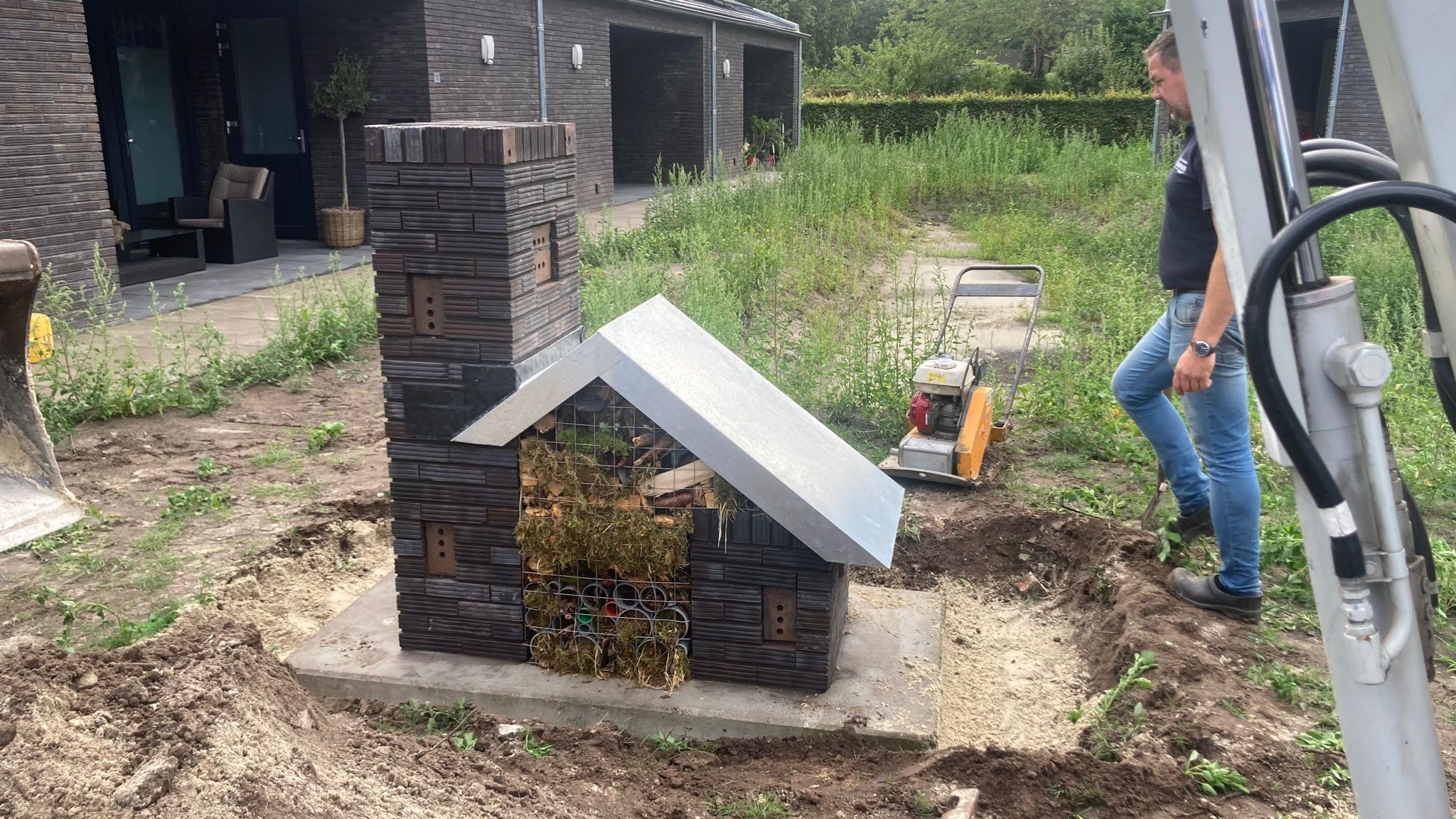 Een officiële bouwtekening wordt gemaakt en op onze werkplaats gaat leerling Leon aan de slag met het metselwerk. De “Aron” gevelstenen die bij het bouwproject gebruikt zijn (door de architect ontworpen en waarvan nog een kleine voorraad over was) worden ook in het insectenhotel toegepast. Doen we ook nog een klein beetje aan circulair bouwen. Aan weerszijden wat sparingen. Een zinken dakje. De meiden van Hendriks vullen het middenstuk met groen uit bos en eigen tuin. Vervolgens verplaatsing van werkplaats naar bouwlocatie en wachten op de onthulling. Nu hopen dat de ontvangers net zo enthousiast zijn als de makers!