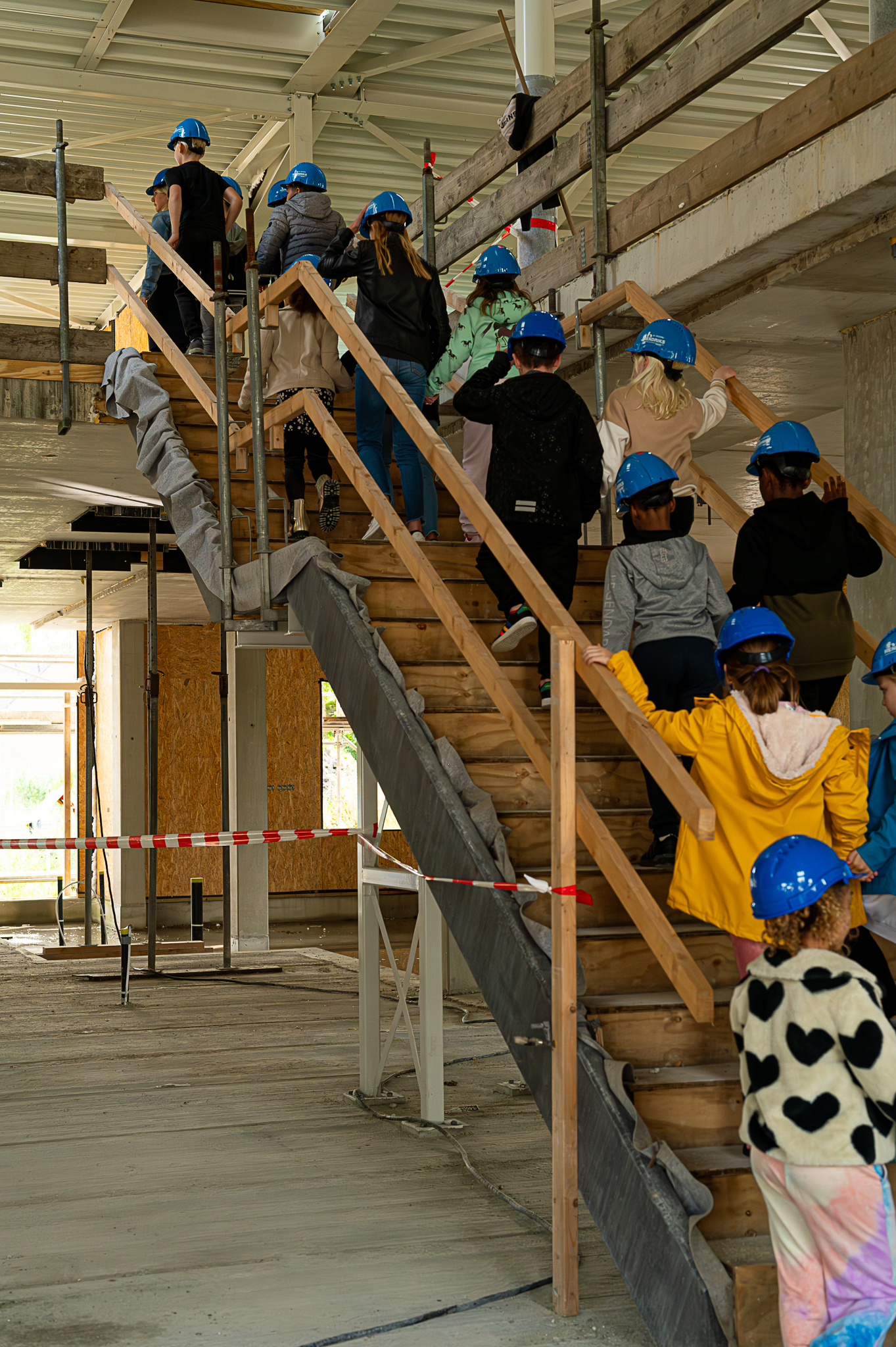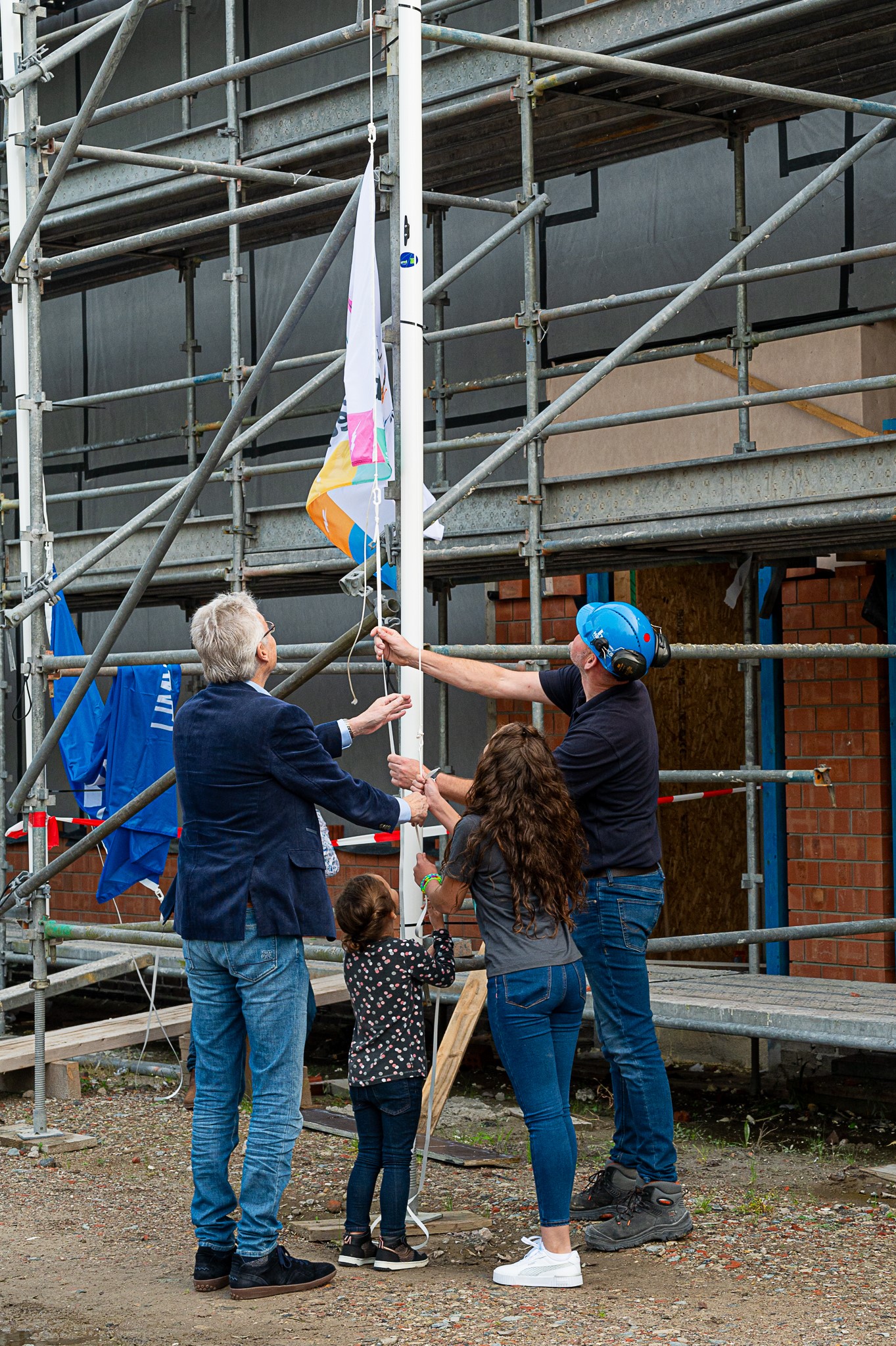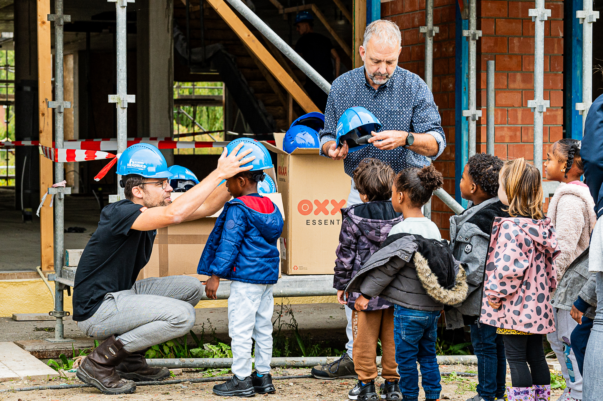 Inmiddels hebben we het hoogste punt bereikt op de bouw in Delfzijl en dus werd de vlag gehesen. Goede reden voor een feestelijke activiteit! De toekomstige gebruikers mochten een rondje doen in de nieuwe school en omdat er nog hard gewerkt wordt moest iedereen een (soms wat te grote) bouwhelm op. Dat was natuurlijk een hele happening! Heerlijk om al die vrolijke gezichtjes en enthousiaste reacties te zien en horen!