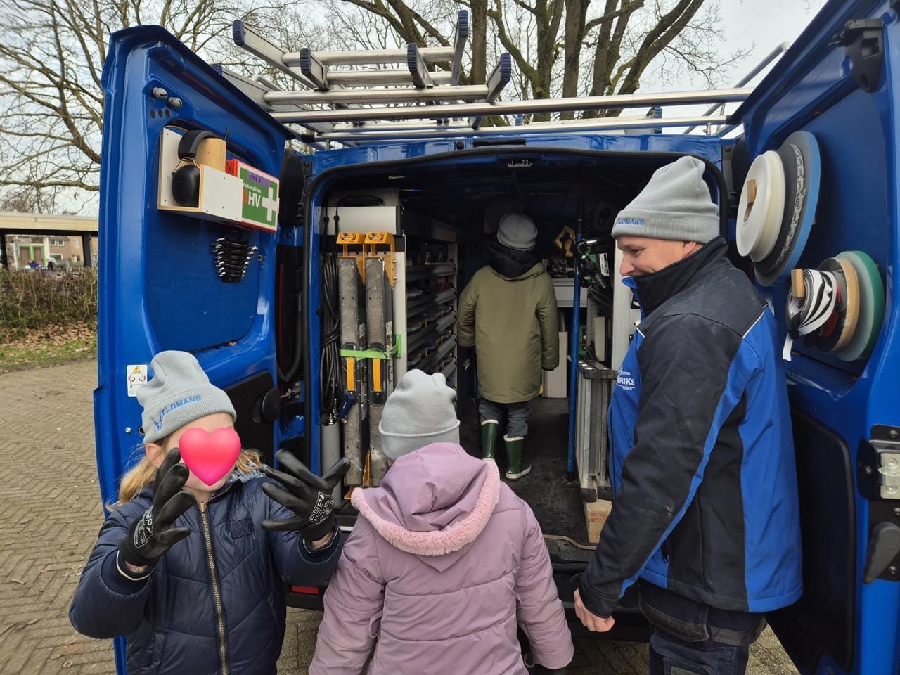 Ze vertelden over het werk van een timmerman, er werd een quizje gedaan over gereedschap en de kinderen hadden tal van vragen die natuurlijk in geuren en kleuren werden beantwoord door onze mannen. Maar het leukste moment? Dat was zonder twijfel dat de kinderen zelf in onze werkbus en verreiker mochten kijken. Even achter het stuur zitten van zo'n groot gevaarte en natuurlijk flink toeteren!